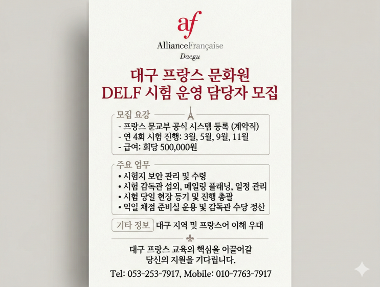 대구 프랑스 교육의 중심, 알리앙스 프랑세즈와 함께할 인재를 모십니다! 대구 알리앙스 프랑세즈에서 연 4회 진행되는 DELF 시험을 원활하게 운영해주실 'DELF 시험 운영 담당자'를 모집합니다. 프랑스 교육부 공식 시스템에 등록되어 (계약직) 전문적인 경력을 쌓을 수 있는 기회입니다. 모집 요강 ▪️ 시험 일정: 연 4회 (3월, 5월, 9월, 11월) ▪️ 급여: 회당 500,000원 ▪️ 주요 업무: 시험지 보안 관리, 감독관 섭외 및 일정 관리, 시험 당일 진행 총괄, 익일 채점 준비실 운용 ▪️ 우대 사항: 대구 지역 거주 및 프랑스어 이해 우대 대구 프랑스 교육의 발전을 위해 열정적으로 함께해주실 분들의 많은....... <img src="https://blogthumb.pstatic.net/MjAyNjAzMDRfOTQg/MDAxNzcyNjE3Nzk2NjM4.OpHkSeOchXkjECkcfN3itst1uJVIeN4zy4oThYFBgswg.Az5Csu6WRT_PKwTjE685mnYDPB3NisTzp2-DzCodIwkg.PNG/afdaegu.png?type=s3" />