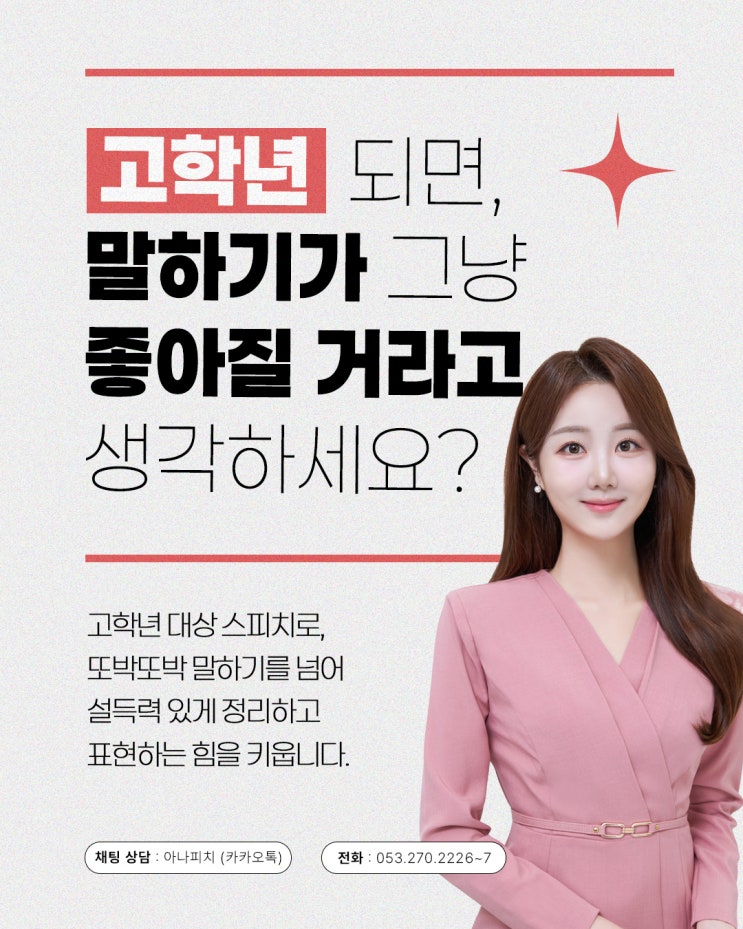 안녕하세요! 아나피치입니다 초등학교 고학년 시기에는 생각이 깊어지고, 자기 의견이 또렷해지는 시기이지만 막상 말로 표현하는 건 어려워하는 친구들이 많은데요. 그래서 준비했습니다 ✨ 초등 고학년(4~6학년) 대상 키즈스피치 프로그램! 또박또박 말하기를 넘어 생각을 정리하고 논리적으로 전달하고 설득력 있게 표현하는 힘을 키우는 시간입니다! 왜 고학년 스피치가 중요할까요? 고학년이 되면 발표, 토론, 수행평가, 면접형 수업까지 “말하기 능력”이 곧 학습 경쟁력이 됩니다. 단순히 발표를 잘하는 것이 아니라 ✔ 자신의 생각을 구조화하는 힘 ✔ 친구들과 소통하는 능력 ✔ 무대 앞에서도 당당한 자신감....... <img src="https://blogthumb.pstatic.net/MjAyNjAyMjdfMTIz/MDAxNzcyMTU3MzQ0MzA3.JtGp2cAOxfKPVe5_QwAAkY9AzBHaMP40ncnW1A7uG0kg.d8UznDx8xy-ZBYPdAUZ_esJD0PBrFxKNs2KkubJPCUog.JPEG/1.jpg?type=s3" />