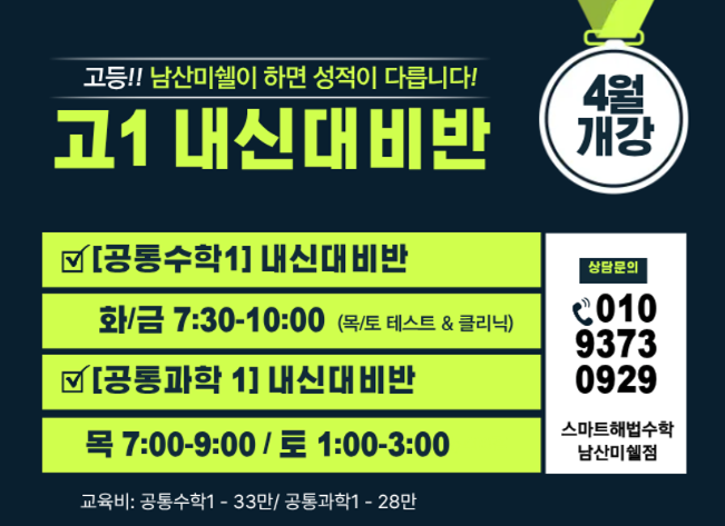 남산동 수학학원 남산미쉘 │ 고1 내신대비반 개강 안내 고등학교 내신은 단순히 문제를 많이 푸는 것만으로는 준비하기 어렵습니다. 학교 시험 범위에 맞춘 개념 이해, 그리고 시험 유형에 맞는 실전 적용 연습이 함께 이루어져야 안정적인 성적을 만들 수 있습니다. 남산미쉘에서는 고등학교 1학년 학생들을 위한 내신 대비 집중 관리반을 운영합니다. 고1 내신대비반 남산미쉘의 내신 대비 수업은 학교 시험을 기준으로 ✔ 핵심 개념 정리 ✔ 시험 유형 문제 풀이 ✔ 실전 테스트 ✔ 취약 부분 클리닉 까지 함께 진행됩니다. 단순 진도 수업이 아니라 시험 대비에 맞춘 관리형 수업입니다. 공통수학1 내신대비반 ⏰....... <img src="https://blogthumb.pstatic.net/MjAyNjAzMTVfMjM3/MDAxNzczNTY4NTU0NTEw.cHwYADpnjREE-ZgW-rz4U_VBsShdJ3UGNExxinoqM1kg.SMoXw9MIQMcv5RkBG4-lCMcfaZkBPMSU0zu3z9SAr0og.PNG/1773568484974.png?type=s3" />