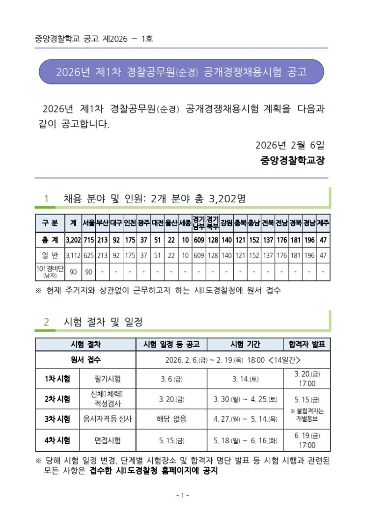 안녕하세요 여러분 올패스입니다. 26년 1차 경찰 시험 접수가 시작되었습니다. 동시에 26년 경찰 1차 채용 분야 및 인원이 공개되어서 안내드립니다. 25년 2차와 비교했을 때 채용 인원이 줄어든 곳도 있지만 서울, 부산, 경기남부 등은 2차와 비교했을 때 인원이 많이 늘어난 지역에 속합니다. 26년 1차 경찰시험은 오늘부터 접수가 시작되었습니다. 지역별 채용 예정 인원을 잘 확인하시고 원하시는 지역으로 빠르게 접수하시길 바랍니다! 시험과 관련된 더 자세한 내용은 첨부해드린 파일을 확인 부탁드립니다. 경찰 시험을 준비하고 계시는 올패스 독학원 학생 분들이 원하시는 결과를 얻을 수 있도록 끝까지 응원하겠습니다!!! 대구경찰독서....... <img src="https://blogthumb.pstatic.net/MjAyNjAyMDZfMjU4/MDAxNzcwMzY5NzgyMDgx.4lqrldZuvKW8bB6-RiVn6L91q8hznrZxerqjhudMXwMg.U8MyJO8SFHBQAYq7H7DiWdAnFreDr0aDl-oAEp0HqpUg.JPEG/%2726%B3%E2_%C1%A61%C2%F7_%B0%E6%C2%FB%B0%F8%B9%AB%BF%F8%28%BC%F8%B0%E6%29_%B0%F8%C3%A4_%B0%F8%B0%ED%B9%AE%28%C3%D6%C1%BE%29_1.jpg?type=s3" />