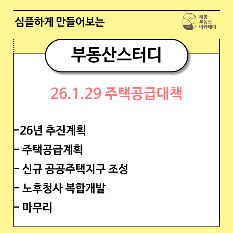 지난 「9.7주택공급확대방안」을 통해 발표한 2030년까지 5년간 135만호(27만호/年)규모의 신규주택 착공을 새정부 공급 목표로 한다고 밝혔습니다. 이후 「주택공급촉진 관계장관회의」를 신설하여 공급부지 발굴의 첫 성과로, 신규 부지뿐만 아니라 기존사업의 신속화 방안에 대한 발표가 있었습니다. 오늘은 지난 1.29 주택공급방안+ 에 대해 알아보겠습니다. 26년 추진계획 제도개선 -보상등 택지사업 조기화 계획 -도심복합사업 시즌2 계획 -정비제도 종합개편 법안 계획 주택공급 도심공공복합사업과 신축매입임대 등 도심에서 총 5.8만호 착공계획 과 2기,3기 신도시 등 택지를 총 5.3만호 착공과 신규택지 4곳 지구지정을 추진할 계획입....... <img src="https://blogthumb.pstatic.net/MjAyNjAyMTNfNzIg/MDAxNzcwOTk0Njg3NTY3.v6m-9ZhulmrCcTVqbcex-3unR7KS6ejjpoOKXhMGAyIg.PFbpDWw5h87pIv55bn_ufLmqmdHO4cPhpK32lWQ89uAg.PNG/%C7%D8%BA%BD%BA%ED%B7%CE%B1%D7_%BA%B9%BB%E7%BA%BB-001_%2815%29.png?type=s3" />