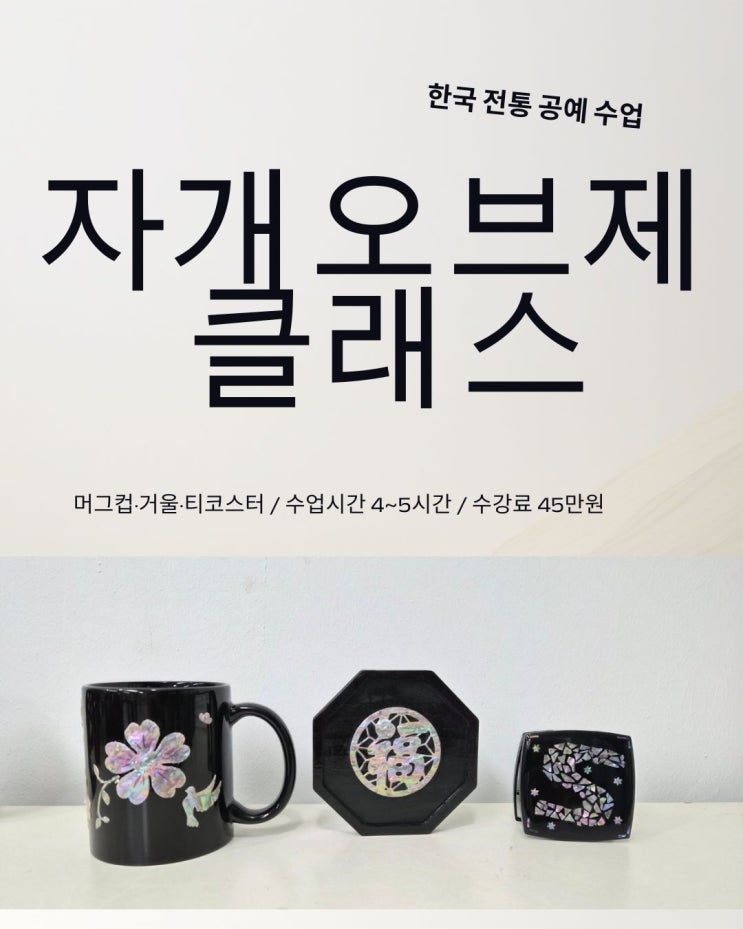 자개공예 자격증까지 한번에? 자개오브제클래스 ✨ 빛의 각도마다 색이 달라지는 자개, 한번쯤 직접 만들어보고 싶다고 생각하신 적 없으셨나요? 전통 공예라고 하면 왠지 어렵고 멀게 느껴질 수 있는데요. 자개오브제클래스에서는 처음 접하는 분도 4~5시간 안에 완성작 3개를 만들 수 있도록 기초부터 차근차근 알려드려요. 단순 체험을 넘어 실력까지 쌓고 싶은 분들을 위한 수업입니다. ▣자개공예, 이런 매력이 있어요 자개공예는 조개껍데기 안쪽의 은은한 빛을 내는 부분을 얇게 가공해 생활 소품에 장식하는 우리나라 전통 공예예요. 보는 각도마다 색이 달라 보이는 특유의 오묘함은 어떤 소재로도 흉내 낼 수 없는 자개만의 매....... <img src="https://blogthumb.pstatic.net/MjAyNjAzMDJfMTI2/MDAxNzcyNDM2MjgwNjI3.EuHc63x4bGkZi2Wap7wuolZGXTsz23JeEyIVjFznmPsg.zzdnWyf1AWwcKNdiYs93XpV417h0AGEDtU2PAI5ctRAg.JPEG/%C0%CE%BD%BA%C5%B8%B1%D7%B7%A5_%B0%D4%BD%C3%B9%B0_-_%C0%DA%B0%B3%BF%C0%BA%EA%C1%A6%C5%AC%B7%A1%BD%BA.jpg?type=s3" />