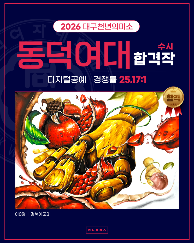 대구 입시미술학원 기초디자인 최강자 대구천년의미소가 전해드리는 2026학년도 대입 수시합격 재현작! 이전 포스팅에 이어 오늘은 동덕여대 디지털공예과 합격재현작을 소개합니다. 대구천년의미소 학생들의 놀라운 실기수준과 합격 비결을 꼼꼼하게 확인해보세요. 26학년도 수시에서 동덕여대 디지털공예과에 최초합격한 고3 현역 학생의 합격재현작입니다. 이 학생은 고2때였던 2024년 동덕여대 실기대회에서 예비반 동상을 수상하기도 했습니다. 25대1의 경쟁률을 돌파하고 동덕여대 디지털공예과에 26학번으로 입학하게 된 대구천년의미소 학생의 합격인터뷰도 살펴보세요. 동덕여대 디자인계열 입시에서 매년 꾸준한 입결을 보이고 있는 대....... <img src="https://blogthumb.pstatic.net/MjAyNjAzMDNfOCAg/MDAxNzcyNTI1OTY3NDQw.wpdmwMYLcDNZzeJVyqHhtPev8ReaW97E3Rw9_xwRsjkg.sVSRrD-zZ4IndJWXzf3yRCVSKfTaimUGzAHoGEZwhbQg.PNG/26%C7%D5%B0%DD%C0%E7%C7%F6%C0%DB_1_copy.png?type=s3" />