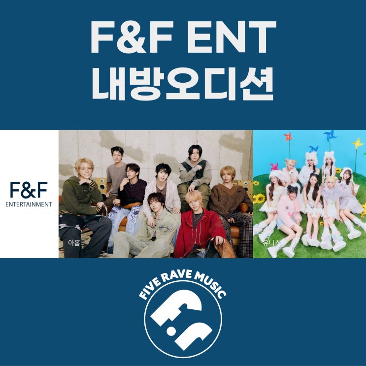 K-POP 아이돌, 가수 지망생인 초등학생, 중학생, 고등학생이라면 오늘의 포스팅을 집중해주세요! 다가오는 2026년 3월 7일 토요일 오후 2시에 파이브레이브뮤직학원에서 F&F 엔터테인먼트 내방오디션을 진행할 예정이에요! F&F 엔터테인먼트의 소속 아티스트로는 아홉(AHOF), 유니스(UNIS) 등이 소속되어 있는데요 F&F 엔터테인먼트는 오디션을 통해 뛰어난 아티스트 재능을 가진 학생들을 찾아 그 재능을 더욱 빛날 수 있는 기회를 제공해 함께 멋진 미래를 만들어가고자 한다고 합니다. 미래 K-POP 음악 문화를 이끌어갈 글로벌 K-POP 아이돌, 가수가 되고 싶은 학생이라면 이번 내방오디션에 꼭 참여해서 꿈을 향한 기회를 가질 수....... <img src="https://blogthumb.pstatic.net/MjAyNjAzMDNfODIg/MDAxNzcyNTIyNTc3NTgz.syH-SoDL-2BJBLV8f9zvkf2TNrw9AanPDYXUZygkY_Yg.CgVHtLKtpvd5zi4gJ57U-5dJVCpk6vqLCX3QJiVlA5gg.JPEG/FF%BF%C0%B5%F0%BC%C7%28%BA%ED%BD%E6%29.jpg?type=s3" />