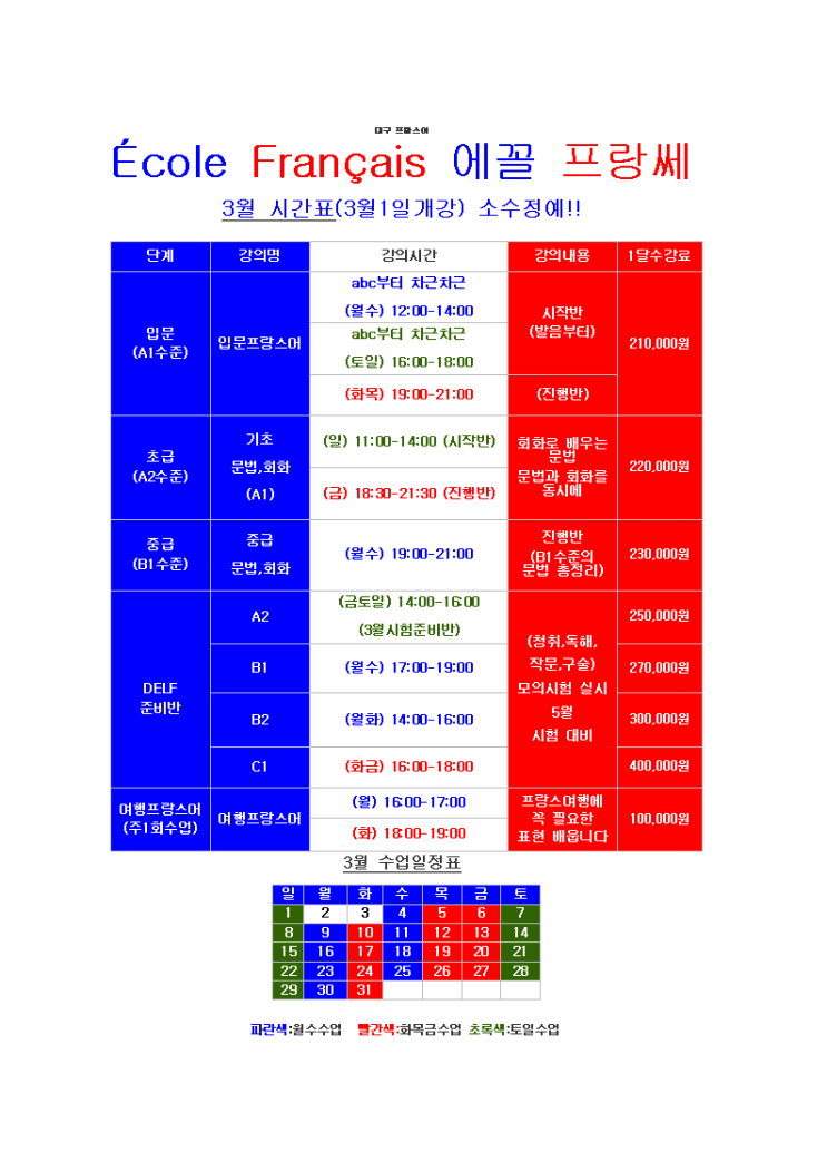 대구 프랑스어(불어) 전문학원 '에꼴프랑쎄프랑스어교습소' 2026년 3월 수업시간표