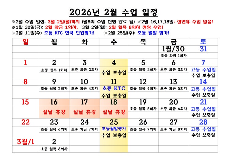 2월은 한 해의 학습 흐름이 자리를 잡아가며, 3월 새학기를 앞두고 준비를 마무리하는 중요한 시기입니다. 그동안의 학습 내용을 점검하고, 부족한 부분을 보완하며 새 학년을 안정적으로 시작하기 위한 정리 단계이기도 합니다. 학원에서는 2월 수업을 통해 학생 개개인의 학습 상태를 꼼꼼히 확인하고, 새 학기 수업으로 자연스럽게 이어질 수 있도록 지도할 예정입니다. 이 시기의 관리와 준비가 3월 이후 학습 적응과 성과에 큰 영향을 주는 만큼, 더욱 세심하게 살펴보겠습니다. 다가오는 새 학기를 자신감 있게 맞이할 수 있도록, 2월 한 달도 책임감 있게 함께하겠습니다. <img src="https://blogthumb.pstatic.net/MjAyNjAyMDRfMjM5/MDAxNzcwMTg0NzE2MTI1.FhYEBjijFq-acSTAseERas1L874zmttwCZqrkDNoA1cg.VSg1lZItST8mLbUJPRsC5FrKgwDbS1M_KoeJ5BGFozkg.JPEG/2026%B3%E2_2%BF%F9_%BC%F6%BE%F7_%C0%CF%C1%A4001.jpg?type=s3" />