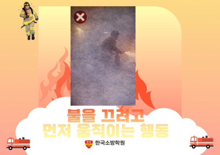 화재는 예고 없이 발생합니다. 그리고 화재 현장에서의 단 한 번의 잘못된 행동은 상황을 돌이킬 수 없게 만들 수 있습니다. 소방 현장에서 반복적으로 목격되는 “절대 해서는 안 되는 행동들”, 지금 미리 알고 피하는 것이 가장 확실한 대비입니다. 1. 불을 끄려고 먼저 움직이는 행동 화재가 발생하면 많은 사람들이 본능적으로 불을 끄려고 움직입니다. 하지만 초기 화재가 아닌 경우, 일반인이 진압을 시도하는 것은 매우 위험합니다. 불길보다 빠르게 퍼지는 연기와 유독가스로 인해 대피 시점을 놓치게 되는 경우가 많습니다. 화재 현장에서 가장 우선해야 할 행동은 진압이 아니라 대피입니다. 2. 연기의 위험을 가볍게....... <img src="https://blogthumb.pstatic.net/MjAyNjAyMDZfMTI2/MDAxNzcwMzc3NTc0NTYz.w_IjHhn-uBAueHiG3kYrae9X0NhMw_JtqxCWjnLOqQUg.34A35nOOyuoUDcnFHORwMpkInF4mIFjPIJlmrD44TEIg.JPEG/3.jpg?type=s3" />