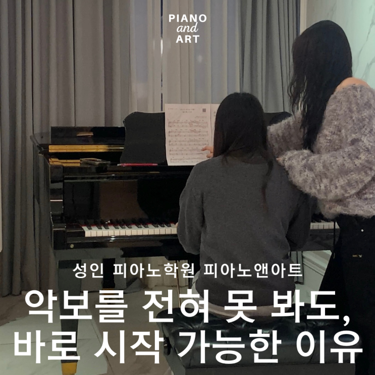 안녕하세요 :) 대구성인피아노학원 피아노앤아트입니다! “피아노 처음인데 악보 못 봐도 될까요?” 결론부터 말씀드리면, 악보를 전혀 못 보셔도 바로 시작할 수 있습니다. 실제로 ♂️♀️ 성인 수강생의 70~80% 이상이 악보를 거의 보지 못하는 상태에서 레슨을 시작을 하시는데요. 같은 질문에, 피아노 전문가들은 오히려 이렇게 답합니다 악보를 못 보기 때문에 효과적이고 체계적인 개인 맞춤형 레슨이 필요합니다. 중요한 것은 출발선이 아니라, 어떤 방식과 환경에서 배울지 입니다. 악보를 못 봐도 시작 가능한 이유 피아노는 이론 중심 악기가 아니라 소리와 손의 감각이 중심이 되는 악기입니다. 그래....... <img src="https://blogthumb.pstatic.net/MjAyNjAyMTJfODcg/MDAxNzcwODk1Mzc5MjE0.B5tBI-LiS-5vBa4M4YtGfSReHZyqsEC1fb6i6GWcMdAg.vQ0iPdI0zNPTWGYT3BpmjlBSvABN9wL2o9xX-Z0VcPkg.PNG/%BA%ED%B7%CE%B1%D7_%B4%EB%C7%A5%BB%E7%C1%F8_%BE%E7%BD%C4.png?type=s3" />