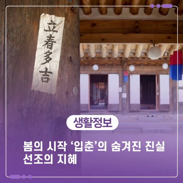 2026년 새해 복많이 받으셨나요? 겨울이 긴 만큼 새해의 새로운 봄이 기대되는 시기입니다. 입춘의 의미 음력 1월, 양력 2월 4일경이며, 태양의 황경이 315°에 와 있을 때이다. 봄으로 접어드는 절후로 음력으로는 섣달에 들기도 하고 정월에 들기도 하며, 정월과 섣달에 거듭 들기도 한다. 이러한 경우에는 재봉춘(再逢春)이라 한다. 정월은 새해에 첫번째 드는 달이고, 입춘은 대체로 정월에 첫번째로 드는 절기이다. 입춘은 새해를 상징하는 절기로서, 이날 여러가지 민속적인 행사가 행해진다. 그 중 하나가 입춘첩(立春帖)을 써 붙이는 일이다. 이것을 춘축(春祝)·입춘축(立春祝)이라고도 하며, 각 가정에서 대문기둥이나 대들보·천장 등에....... <img src="https://blogthumb.pstatic.net/MjAyNjAxMDdfMjIg/MDAxNzY3NzU0ODk4MjIx._nXlBK7Kw1VpyvwyD1kD8hLbnfX8R7mff3-NaM10Yuwg.LAtmw3ezghelegM0rj0xTFEMeuonJIPBpovX4Nc0BdYg.JPEG/image-1767754051065.jpg?type=s3" />
