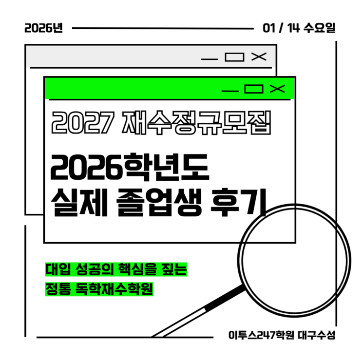 안녕하세요! 대구 독학재수학원의 정통성을 잇는 이투스247학원 대구수성점의 블로그지기, 사칠이입니당! 오늘은 2026학년도, 한해 거의 가득 우리 대구 독학재수학원에서 독학관리를 받고 수능에서 좋은 성적을 거둔 선배의 졸업수기를 가지고 왔어요! 매년 수능이 끝난 후 졸업생 친구들의 졸업후기를 받고 있는데, 올해도 우리 학원에서 보낸 학습시간과 노하우가 생생히 담긴 글이라서 꼭! 읽어보시길 바랍니다 2026학년도 수능을 끝내고 안녕하세요. 저는 2026학년도 수능을 치르고 이투스247학원 대구수성 1관에서 재수를 마친 졸업생입니다. 이 글은 그냥 재수를 고민하는 후배들이 있다면 한 번쯤 읽어봤으면 좋겠다는 마음으로 씁니....... <img src="https://blogthumb.pstatic.net/MjAyNjAxMTRfMjcz/MDAxNzY4MzkwNDYzMTU1.Igc-gSbKedh6psEvRDH8PY32LkXNkIex5A48dgJaF8Mg._FChAMVUTX6OLZum3_YY8v1XUHSvSsLaAt6wEqtZJ6Ig.PNG/%C1%A6%B8%F1%C0%BB_%C0%D4%B7%C2%C7%D8%C1%D6%BC%BC%BF%E4_-001_%2819%29.png?type=s3" />