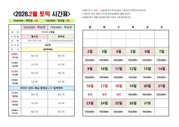 2월 시간표 & 설맞이 이벤트 + 강사진 안내 "올해는 영어 좀 해볼까?" 생각만 하다 1월 지나가신 분들 많죠? 2월이 진짜 시작 하기 좋은 타이밍이에요! 대구 영어회화·토익학원 ELA어학원 2026년 2월 회화 / 토익 시간표와 함께 설맞이 할인 이벤트, 강사진까지 함께 한번에 안내드릴께요! 영어회화 수업, 이렇게 진행돼요. ELA어학원 영어회화 수업은 완전 기초부터 원어민 고급 회화까지 단계별로 나뉘어 있어요. 회화 개강일 ●월·수반 : 2월 2일 개강 ●화·목반 : 2월 3일 개강 레벨 구성 Lv.1~2 : 기초 회화+ 문법 , 회화가 처음인 분들 OK Lv.3~4 : 일상회화, 상황별 표현 연습 Lv.5 : 프리토킹 중심 수업 Lv6~8(원어민 수업....... <img src="https://blogthumb.pstatic.net/MjAyNjAxMjdfMjYx/MDAxNzY5NTAzMjMxMTkx.PgIbdtBtav4g0oyaBsLZJVw-02aEfkbKbEaHmTRmINcg.csPt7O7Jq1IFlf8EEll4ezWedI2Am5DThAlAjHZiSRkg.JPEG/2%BF%F9%C5%E4.jpg?type=s3" />