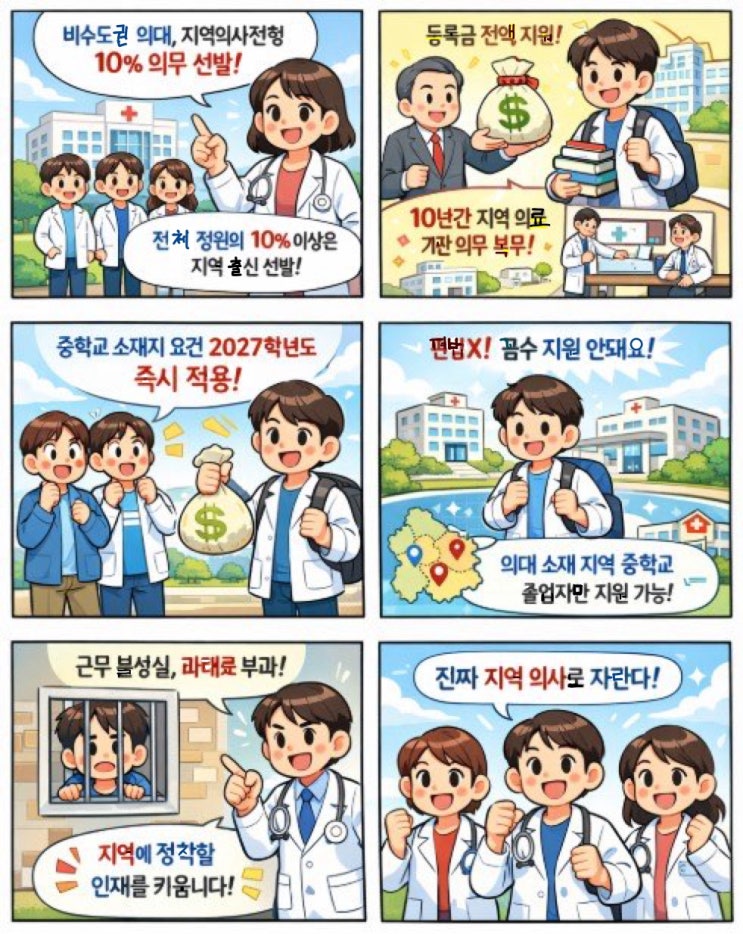 비수도권 의대 32곳 정원 최소 10% 의무 선발... 중학교 소재지 기준 즉각 도입으로 제도 취지 강화 1. 비수도권 의대 지역의사전형 10% 이상 의무화 보건복지부는 비수도권 32개 의과대학이 전체 정원의 최소 10% 이상을 지역의사선발전형으로 선발하도록 시행령에 명시 이는 보건의료정책심의위원회가 정한 의사 인력 양성 규모의 ‘하한선’ 해당 전형은 100% 지역학생 선발이 필수 대학별 정확한 비율은 → 지역 의료 수요·의료 자원을 고려해 추후 고시로 확정 2. 지역의사 선발 학생 혜택과 의무 혜택 등록금, 교재비, 실습비, 기숙사비 등 학비 전반을 국가가 전액 지원 의무 재학 중: 지역 보건의료·공공의료 중심 특화 교육과....... <img src="https://blogthumb.pstatic.net/MjAyNjAyMjdfMjQw/MDAxNzcyMTkwOTE4OTg4.JFho3RcZGnN3840Rpr3lD2i4O-N5a6D2hXYc2gEje-Ig.QZ6c5ysijp9l6VN0UV95BU0sZhWNlzfrWYw7_rnb1Hsg.JPEG/KakaoTalk_20260227_201345206.jpg?type=s3" />
