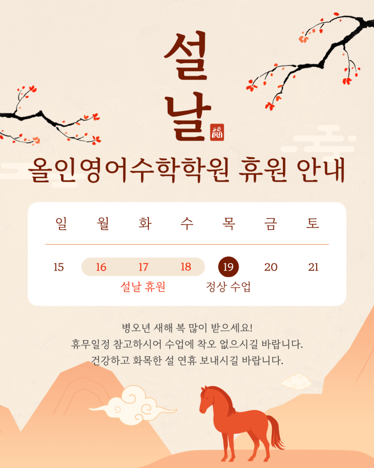 안녕하세요, 대구 동구 신서동에서 학생들의 성장을 함께하고 있는 올인영어수학학원입니다. 2026년의 시작이 엊그제 같은데, 벌써 민족 최대의 명절인 설날이 다가왔습니다. 겨울방학 기간 동안 매일 학원에 등원하며 학업에 매진해 온 우리 아이들의 기특한 모습이 눈에 선합니다. 늘 저희 학원을 믿고 소중한 자녀를 맡겨주시는 학부모님들께도 이 자리를 빌려 깊은 감사의 인사를 올립니다. 설 연휴 휴원 일정 안내 설 연휴 기간 동안 올인영어수학학원은 우리 학생들이 가족과 함께 따뜻한 시간을 보내고, 다시 힘차게 공부할 수 있는 에너지를 충전할 수 있도록 아래와 같이 휴원합니다. 휴원 기간: 2월 16일(월) ~ 2월 18일(수) (3일간) 정....... <img src="https://blogthumb.pstatic.net/MjAyNjAyMTRfMjIy/MDAxNzcxMDQ4MTM2NjUz.bSe_SZnXoLLzXB9TkZiWrSGyGoJ9RtGgqzhitOMKiLwg.Se9nWiAknZFa_VtWkfIGM-gldr5OxqVDy6xv2ZKINu8g.PNG/%C1%A6%B8%F1%C0%BB_%C0%D4%B7%C2%C7%D8%C1%D6%BC%BC%BF%E4._%281%29.png?type=s3" />