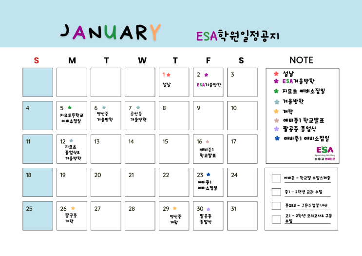 안녕하세요! ESA 영어학원입니다. 2026년 새해를 맞이하며, 우리 아이들의 새로운 시작을 응원하는 마음으로 1월 학원 일정과 겨울방학 학원일정을 정리해 드립니다. 학부모님들께 도움이 될 수 있도록, 2026년 1월의 핵심 일정과 ESA만의 탄탄한 커리큘럼을 상세히 안내해 드릴게요. 지묘동 영어 교육의 중심 ESA 영어학원입니다. 어느덧 2025년을 마무리하고 희망찬 2026년 새해를 앞두고 있습니다. 겨울방학은 단순히 쉬는 기간이 아닙니다. 다음 학년으로 올라가기전, 1학기 영어 교과를 완벽하게 선점할 수 있는 '골든타임'이죠. 특히 예비 중1, 예비 고1 학생들에게는 학습의 질이 달라지는 매우 중요한 시기입니다. ESA 영어학....... <img src="https://blogthumb.pstatic.net/MjAyNTEyMjVfNjcg/MDAxNzY2NjU4MDI0NTM2.ks-ptXAvIP8OPxe2x8Nfysn5ZvtiFzpVa2sHC7Kpv6og.52intKaY-k0zNpIBFuaQ7KMnZhnJO-Y-8IlPD2VS7X4g.PNG/ESA_2026%B3%E2_%C0%CF%C1%A4%C7%A5.png?type=s3" />