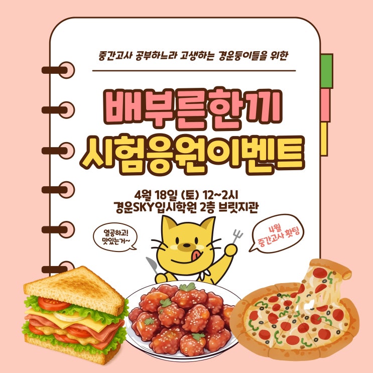 대구 수학학원 열심히 공부 중인 경운둥이 모두 함께 즐기는 맛있고 배부른 한끼 이벤트 시작해야죠? 대구 중간고사 학원 응원 이벤트 중간고사 공부하느라 고생하는 경운둥이들을 위한 배부른 시험응원 이벤트! ✔️4월18일(토)12~2시 ✔️경운SKY입시학원 2층 브릿지관 맛있게 먹으면서 남은 기간 열공하자 단순한 급식이 아닌 아이들이 먹고 싶은 메뉴를 직접 반영해서 차린 말 그대로 학생들을 위한 한 끼 입니다 평리동 공부방 함께 공부하는 느낌 같이 즐겨봅시다 내신 시험 기간에 진행되는 이 이벤트는 공부하느라 지친 몸과 마음에 맛있는 음식으로 활력을 불어넣은 이벤트 얘들아 뭐 먹고싶어? 피자, 샌드위치, 치킨, 볶음밥등....... <img src="https://blogthumb.pstatic.net/MjAyNjA0MTZfMTc3/MDAxNzc2MzE1Mzc5NDgz.SrGIPLgoCzgAfwp1hq-1kXBGdnp42mFl1xwyNaTrq-Mg.syVZnOigLnnghd3ySmv_Xz_uWiIweE_1OGJ7l8KAGqYg.JPEG/1776315267983.jpg?type=s3" />