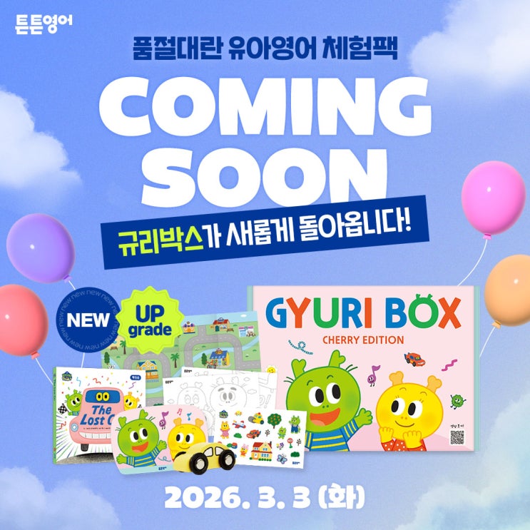 안녕하세요 튼튼영어입니다 3,000명 이상 엄빠들이 반했던 품절대란 유아영어놀이 체험팩 <규리박스> 새롭게 업그레이드 되어 체리에디션으로 돌아왔는데요! 콤팩트한 체험팩으로 튼튼영어 규리와 여동생 체리를 함께 만나며 자연스럽게 일상 속 영어와 친해질 수 있답니다 오늘은 튼튼영어의 규리박스 체리에디션 체험팩 소개! 그리고 스마트스토어 구매 링크를 소개 해드릴게요! ▼▼▼▼▼▼▼▼▼▼▼▼▼▼▼▼▼▼▼▼ 지금 규리박스 만나러 가기 ▲▲▲▲▲▲▲▲▲▲▲▲▲▲▲▲▲▲▲▲ 영어 흥미 치트키 튼튼영어 규리박스 체험팩 5천원대로 가볍게 경험해보세요! New! 규리박스 체험팩(체리에디....... <img src="https://blogthumb.pstatic.net/MjAyNjAyMjdfNjIg/MDAxNzcyMTc5NzgyOTk5.Iz4wePzhpuTs-BgX-jrjW-rn0-SKgEhX8NrgfEAai70g.az-oB0K34HNj54-1xhnw9-wnF2Sc7njmRmt8FRs6Argg.JPEG/%C3%BC%B8%AE%BF%A1%B5%F0%BC%C7_%C4%BF%B9%D6%BC%F8%C0%CE%BD%BA%C5%B8.jpg?type=s3" />