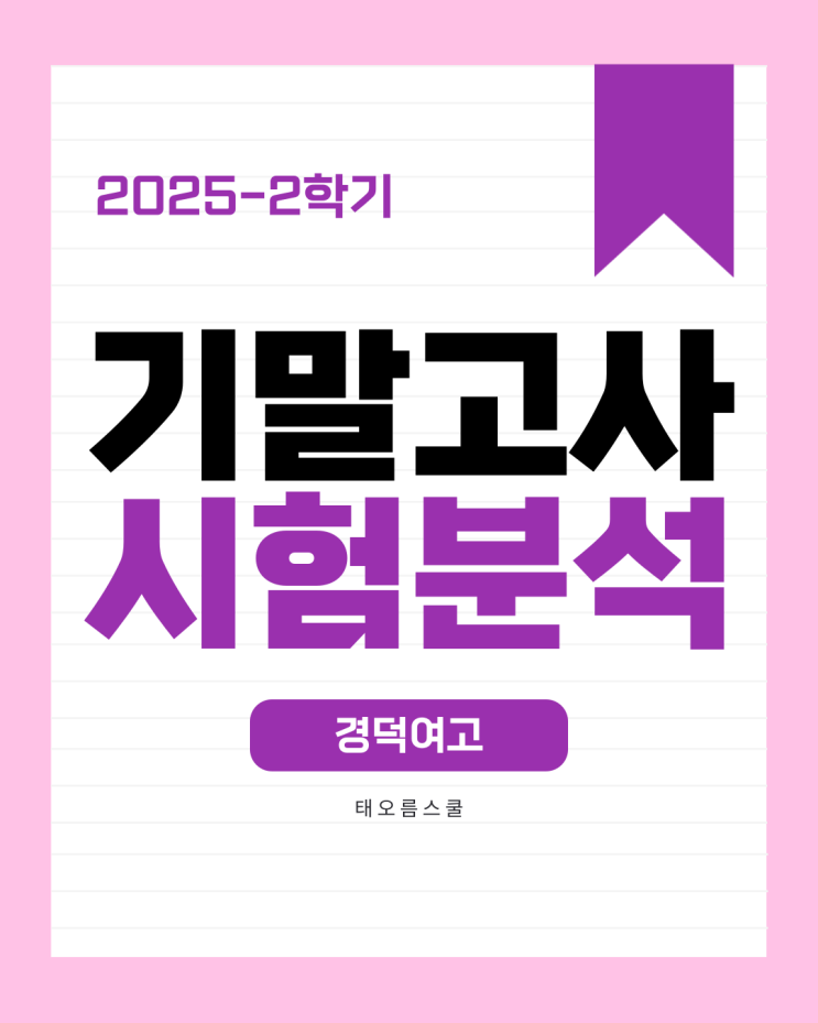 안녕하십니까? 태오름스쿨입니다. 2025학년도 2학기 기말고사가 마무리되며, 이번 글에서는 경덕여자고등학교 1·2학년 기말고사 기출 분석을 정리해드립니다. 단순한 난이도 평가가 아니라, 실제 시험이 어떤 기준으로 출제되었고 앞으로 어떤 학습이 필요한지를 중심으로 정리했습니다. ■ 수학 경덕여고 1학년 수학은 전통적으로 난이도 ‘중’의 선을 지키는 출제가 특징입니다. 이번 시험 역시 교과서 중심으로 출제되었으며, 서술형 문항은 소문항 형태로 세분화되어 체감 부담이 컸을 수 있습니다. 출제 범위: 집합 ~ 유리함수·무리함수 특징: 교과서 유형 숙지 여부가 핵심 포인트: 시중 고난도 문제보다 교과서 문제를 빠르고 정확하게 푸....... <img src="https://blogthumb.pstatic.net/MjAyNjAxMDhfODgg/MDAxNzY3ODU0NTU5NDg3.K9VjX0O8hVL70WPWydbhTjM6psarPDADLf7FkusG9H0g.dgS8eqNbP_eaiH3BIe4noDsSXQ3NUu-4ufysIJcMQ50g.PNG/001.png?type=s3" />