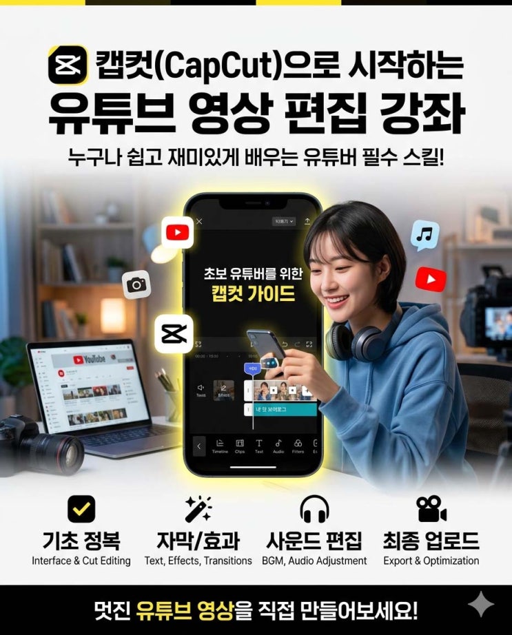 안녕하세요! AI+유튜브영상학원입니다. 유튜브를 시작하고 싶지만 복잡한 편집 프로그램 때문에 망설이고 계시나요? 스마트폰과 PC를 오가며 가장 빠르고 직관적으로 결과물을 만들어내는 '캡컷(CapCut) 실무 유튜브 영상 편집 강좌'가 5월 15일에 개강합니다! 저희 교육원의 철학은 확고합니다. "이론은 최소화, 실습은 최대화!" 단순히 편집 툴의 기능만 배우고 끝나는 수업이 아닙니다. ChatGPT로 기획하고, 캡컷의 AI 기능으로 초고속 편집을 진행하며, Suno AI로 나만의 BGM까지 입히는 철저한 '실전 중심' 강좌입니다. 수료 전 반드시 내 채널에 완성된 영상을 업로드하며, 알고리즘을 공략해 "업로드....... <img src="https://blogthumb.pstatic.net/MjAyNjA0MjhfMjQ2/MDAxNzc3MzQ1NTc0NDkw.bAgNF5iYr61I4dJIWXIG8mHdNoznOrzUefOoqCcoJ9Ag.f4bwRbn3Zezg_OVMz8heNVR-fvDKSzwI3-W9iucYa2gg.JPEG/%C4%B8%C4%C6%B0%AD%C1%C20515.jpg?type=s3" />