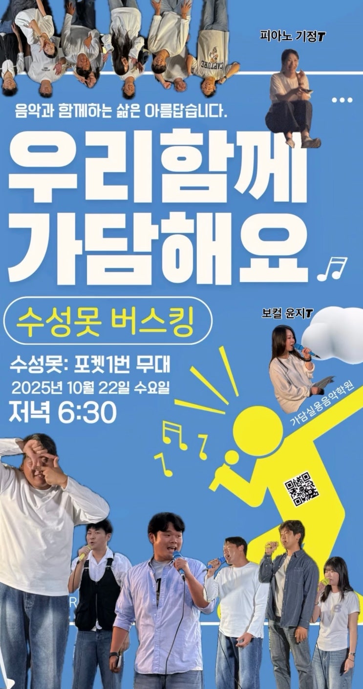 안녕하세요 가담 실용음악학원 입니다! 2025년 가을밤 수성못에서 진행한 버스킹 모습을 정리해 보았습니다! 가담과 함께한 학생분들의 편안하고 소중한 순간을 담은 기록입니다. 누군가는 퇴근 후였고, 누군가는 하루를 정리하러 나온 밤이었고, 그냥 산책하다가 잠시 멈춰 선 분들도 있었어요. 가담에는 회사원, 자영업자, 프리랜서, 학생 등 정말 다양한 직업을 가진 취미생분들이 함께하고 있어요. 그래서 음악 이야기도, 사는 이야기도 각자 조금씩 다른 결을 가지고 있어요. 수성못 버스킹도 잘 보이려고 하는 공연이 아니라 같이 숨 쉬는 음악에 가까웠어요. 조용히 듣다 가는 분도 있었고, 끝까지 자리를 지켜주신 분도 있었고, 박수 대....... <img src="https://blogthumb.pstatic.net/MjAyNjAxMDRfMjg1/MDAxNzY3NTE5NTAzMjMz.XODkbvPjXh8La4y6maXR2Jv2iZ2KzK8M1XW_S-B-Hl8g.oRKrL_7VDjlJJKkPOzY3lf1zMbPr-jqOFQKobLmmQR0g.JPEG/KakaoTalk_20260104_182547061.jpg?type=s3" />