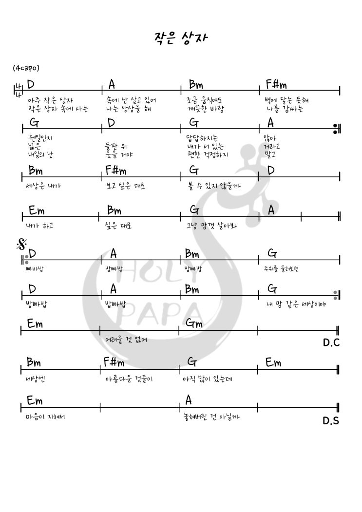 #홀리파파기타교습소 #대구남구통기타 #대구통기타학원 #대구기타교습소 #대구이천동통기타 #대구명덕통기타 #대구교대역통기타 _ 안녕하세요. "홀리파파기타교습소"입니다. 이번 영상은 "산들"의 "작은 상자"를 통기타로 커버 해 보았습니다. 즐거운 취미생활 되세요~!! 난이도: 【★★★☆☆】 _ 주소: 대구 남구 이천로 19길 68 (교대역 월드메르디앙상가 202호) * 지하철 1호선 교대역 도보 15분거리, 주차가능, 악기 비치, 연습실 사용가능 문의: 010-4173-1778 촬영/편집: 디아크스튜디오 THE ARK STUIO 인스타그램: https://www.instagram.com/holypapa_guitar/ _ 연주 영상 | https://yout....... <img src="https://blogthumb.pstatic.net/MjAyNjAxMDZfMjE2/MDAxNzY3Njc2MzM5NzM2.0qDVV8W068awrdcLnRRtCehhm1ATQm3DaUEA3OWHqrYg.UMN0lGvXw_w5M9z7r2VodaUU9xUJNenCyJ_YVzXbo5og.JPEG/%C0%DB%C0%BA_%BB%F3%C0%DA.jpg?type=s3" />