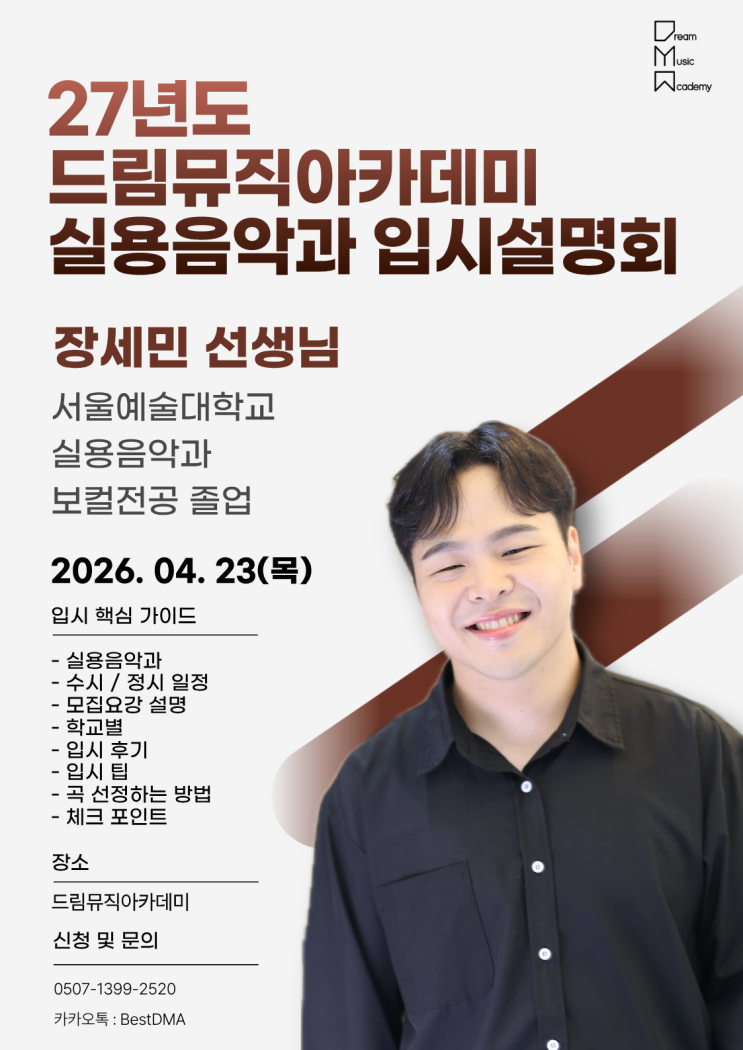 #드림뮤직아카데미 #실용음악입시 #실용음악과 #입시설명회 #27학년도입시 #보컬입시 #서울예대실용음악과 #서울예술대학교 #보컬전공 #예대입시 #입시꿀팁 #대구실용음악학원 #대구실용음악학원추천 #대구보컬레슨 #입시생소통 안녕하세요~ DMA입니다^^ 실용음악과 입시, 어디서부터 시작해야 할지 고민이신가요? !!!이번 4월!!! 저희 드림뮤직아카데미에서 서울예대 출신장세민 선생님의 실용음악과 입시설명회가 열립니다! 일시 : 2026. 04. 23 (목) 오후 7시 장소 : 드림뮤직아카데미 ***설명회 핵심 포인트 *** 입시 핵심 가이드: 수시/정시 일정 완벽 정리 전략의 차이: 학교별 모집요강 분석 및 체크 포인트 가장 중....... <img src="https://blogthumb.pstatic.net/MjAyNjA0MDdfMTc0/MDAxNzc1NTYxMTI1NjMy.9rJdwBZLErykiVhyrPiS3X9y16bsvB0WAmhFssgIIOsg.XGa4yNiZhIlw8qVLiaIUgcrJhCU7EMFn76FzGmrxRvwg.PNG/%BC%BC%B9%CE%BD%DC_%C0%D4%BD%C3%BC%B3%B8%ED%C8%B8.png?type=s3" />