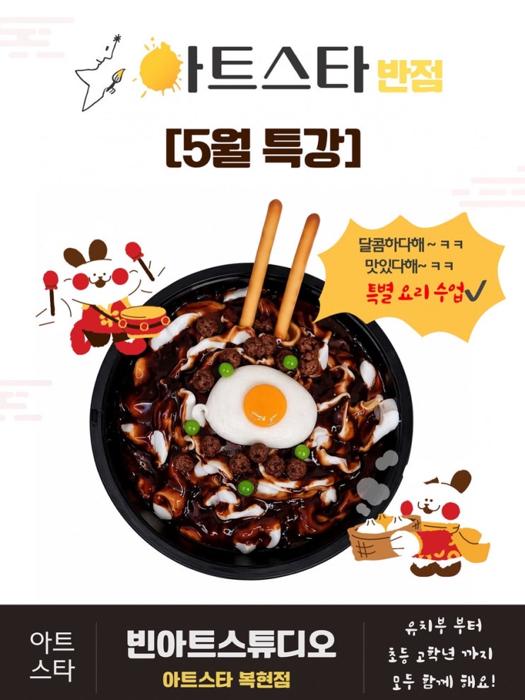5월 요리 특강 수업 준비중 입니다 :-) 더욱 풍성한 수업으로 우리 함께해요 수업문의 : 010 3957 0246 #복현동미술학원 #아트스타복현점 #빈아트스튜디오 <img src="https://blogthumb.pstatic.net/MjAyNjA0MjRfMjA5/MDAxNzc3MDMzNTk3NzU1.f8D_x1nORXBhNOcsHh_NWjddHg3zmAa9_1x59UOb0psg.D8NEQbYyBZqWRccbSSfQXiHOo4gk2xXbAV7CChcrerAg.JPEG/31E1103A%A3%ADFBF1%A3%AD494D%A3%ADB19B%A3%ADEEFA6D523620.jpg?type=s3" />
