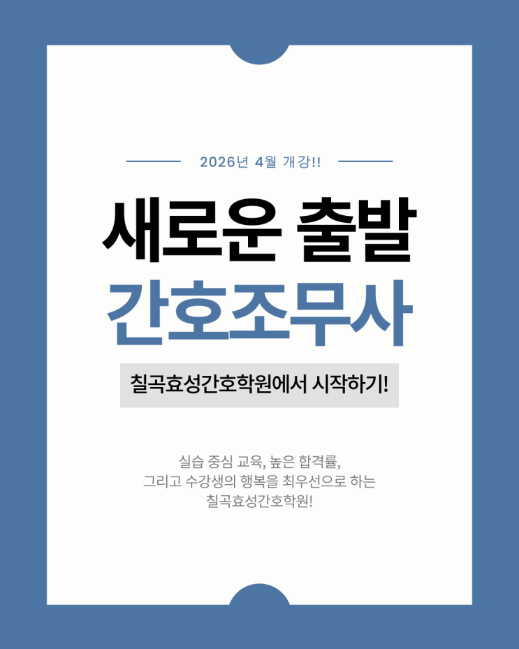 인생 2막, 새로운 출발을 꿈꾸고 계신 여러분 안녕하세요! 자녀 교육과 앞만 보고 달려온 시간을 뒤로하고, 이제는 '나의 일'을 찾고 싶어 고민하시는 분들이 많습니다. 100세 시대에 은퇴는 끝이 아닌 새로운 시작입니다. 자격증 취득부터 취업까지, 5060 세대의 든든한 파트너가 되어드릴 칠곡효성간호학원이 2026년 4월 개강을 앞두고 여러분의 용기 있는 도전을 기다립니다. "나이가 장점이 되는 직업" 간호조무사, 왜 칠곡효성간호학원일까요? 많은 분이 이 나이에 다시 공부를 시작해도 될지 걱정하시곤 합니다. 하지만 간호조무사는 삶의 연륜에서 우러나오는 배려심과 따뜻한 소통 능력이 가장 큰 무기가 되는 직업....... <img src="https://blogthumb.pstatic.net/MjAyNjAyMjRfMTc0/MDAxNzcxOTA4OTQzMDYx.0XOJ_5uaGYulz0AQ9yHTKl1_Kib-g4pCOxa0tMbIt6gg.NAuXzoppdceFETexoOPPwPYSVfKEwqbT1CYQTR0ydbcg.PNG/%B0%A3%C8%A3%C1%B6%B9%AB%BB%E74%BF%F9%B0%B3%B0%AD_%C4%A5%B0%EE%C8%BF%BC%BA%B0%A3%C8%A3%C7%D0%BF%F8_.png?type=s3" />