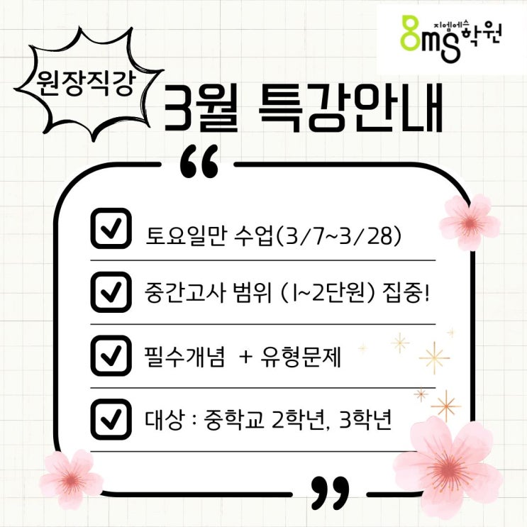 안녕하세요~ 본격적인 새 학기가 시작되는 3월입니다. 곧 다가올 중간고사는 잘 대비 하셨나요? 중간고사를 잘 치고 싶은 중학교 2,3학년만을 위해 준비했습니다. 저희 학원 원장님 수업이 가장 인기있는 이유 아시죠? 탁월한 개념강의, 꼼꼼한 지도와 학생관리! "원장 직강"의 흔하지 않은 기회를 놓치지 마세요! 지금 바로 수학교육 전문가와 상담하세요! https://open.kakao.com/o/sffJGpoe <img src="https://blogthumb.pstatic.net/MjAyNjAyMTNfNDcg/MDAxNzcwOTgyMDg3OTgz.MvF-nC-9npionu3vqKCJ-9pM45s4cHvVfKT7BUzfH64g.CsIu5DgeQgfo9vdc_muvPEQnOM9pHlhBM6PF0zS4BYcg.JPEG/3%BF%F9_%C6%AF%B0%AD2_%281%29.jpg?type=s3" />
