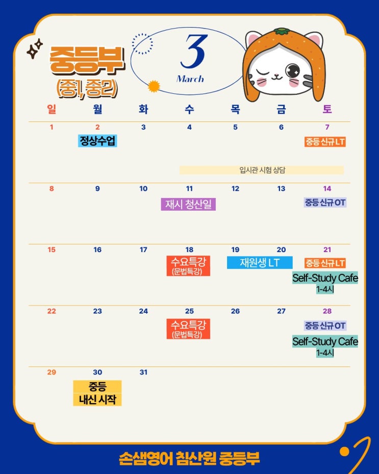 안녕하세요. 침산동 영어학원 손샘영어 침산원 입니다. 2026년 3월 중/고등부 일정 안내드립니다. 3월 각 일정별 상세 안내문은 추후 별도의 안내문으로 발송 드릴 예정이며, 그 때 신청방법 및 기한도 같이 안내드리겠습니다 :) * 학원 사정에 따라 일정이 변동될 수도 있는 점 참고 부탁드립니다. 중등부 3월 일정 안내 고등부 3월 일정 안내 이외에 신규문의 등 다른 추가 문의사항이 있으신 경우에는 언제든 학원으로 문의 주시기 바랍니다. 침산동 영어학원 손샘영어 침산원 전화 053-352-5591 문자 010-4342-0754 항상 결과를 만들어내는 손샘이 되겠습니다. 손샘영어 공식 홈페이지 <img src="https://blogthumb.pstatic.net/MjAyNjAzMDNfMjk3/MDAxNzcyNTM5OTAxMDAz.G8mUgBUo3ByXfsMwamkVB_GVPmQqs1ZCcWwkJD8CBM8g.zTtf5kbA8t8lZi5ZN1D3ZBoVIlib1VvmYvTTwDOswgAg.JPEG/2026._3%BF%F9_%C0%CF%C1%A4%C7%A5.jpg?type=s3" />