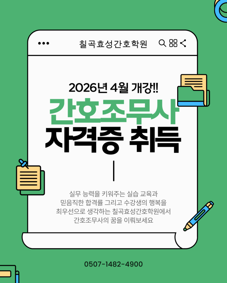 전문적인 보건의료인으로서 새로운 인생을 꿈꾸고 계신가요. 2026년 4월 개강을 앞두고 교육 기관을 고민 중이시라면 실무 역량과 합격이라는 두 마리 토끼를 모두 잡을 수 있는 칠곡효성간호학원을 주목해 보시기 바랍니다. 칠곡효성간호학원은 수강생 여러분이 현장에서 사랑받는 전문가로 거듭나도록 최선을 다하고 있습니다. 실무에 바로 강해지는 실습 중심 교육을 실천합니다 간호조무사 업무의 핵심은 책 속의 이론이 아니라 손끝에서 나오는 정성 어린 간호 기술입니다. 칠곡효성간호학원은 학생들이 병원 현장에 나갔을 때 당황하지 않고 능숙하게 대처할 수 있도록 실습 교육에 가장 큰 비중을 두고 있습니다. 칠곡효성간호학원이 보유....... <img src="https://blogthumb.pstatic.net/MjAyNjAyMjdfMjI1/MDAxNzcyMTc2OTg0MDky.RoQxIzijmaaLvLjGJsLwp_IV4wRyerqGwZXN794ijZog.AOf7EfSqw0oW-nDoOt8-YbGyqiJIqDyMzzbKalLNBiwg.PNG/%C4%A5%B0%EE%C8%BF%BC%BA%B0%A3%C8%A3%C7%D0%BF%F8_%B0%A3%C8%A3%C1%B6%B9%AB%BB%E7%C0%DA%B0%DD%C1%F5_4%BF%F9_%B0%B3%B0%AD_%281%29.png?type=s3" />