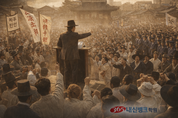 #독립협회 #헌의6조 #열강이권침탈 #만민공동회 #정동구락부 #자주독립 #자유민권 #자강개혁 #근대개혁운동 #365내신뱅크학원 1890년대 후반 조선. 카메라는 한양의 하늘을 비춘다. 연기는 피어오르고, 거리에는 외국 상인과 군인들이 넘쳐난다. 조선은 열강의 먹잇감이 되어 있었다. 영국, 러시아, 미국, 일본, 독일, 프랑스… 각 나라가 조선의 땅과 광산, 철도, 산림을 “이건 내 거, 저건 네 거” 하듯 나눠 먹고 있었다. 이때 조선의 젊은 지식인들이 외쳤다. “나라가 이렇게 뜯겨나가는데, 가만히 있을 수는 없다!” 그들이 바로 독립협회였다. 1. “미운영은아 일직다녀!” — 열강의 이권침탈을 외우는 암호 카메라는 조선 지도 위....... <img src="https://blogthumb.pstatic.net/MjAyNjAzMDlfNjYg/MDAxNzczMDQ1MzgwMDA0.5vyAZEiHCGtiSXluqKDxOV5vap6a8qo1LKIiv_96xYUg.creVl9yDa-GwEqqT2STW3meMyYk7mu68Llevp5CI2fYg.PNG/%B8%B8%B9%CE.png?type=s3" />