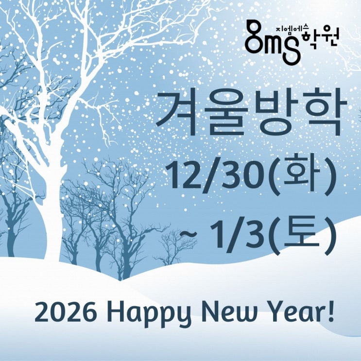 안녕하세요! [지엠에스학원]의 겨울방학 일정 안내 드립니다. 겨울방학 일정은 2025년 12월 30일(화)~ 2026년 1월 3일(토) 입니다. 겨울방학 잘 보내고 2026년에도 열심히 최선을 다해 공부에 전력을 다해봅시다! https://open.kakao.com/o/sffJGpoe <img src="https://blogthumb.pstatic.net/MjAyNTEyMjZfMTk0/MDAxNzY2NzMxOTczNjgy.6fWYRKFq55YD9N1O8WY4YkkM_G7DXykelu1_-2_yHkkg.NZGXHsOakfH0gi5QjkhVK72Fo2-7JmZ6XwaJbxLaMdUg.JPEG/%B0%DC%BF%EF%B9%E6%C7%D0.jpg?type=s3" />