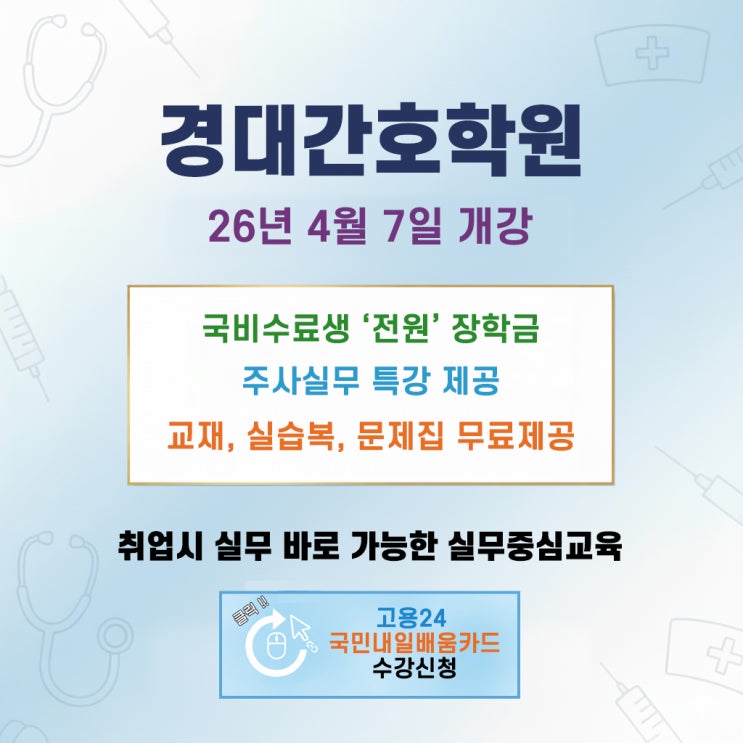 개강일 : 2026년 04월 07일 선착순 모집 시작 간호조무사 과정 등록시 주사실무반 수강 혜택 제공 (정규 과정속에 기본적으로 포함된 주사수업과 다릅니다) 상담 문의 : 053-381-5004 전화상담은 연중무휴 홈페이지 <img src="https://blogthumb.pstatic.net/MjAyNjAxMDZfMTA0/MDAxNzY3Njg1MDA0MDI1.SlkYE_LKW2Hwb7bhxIE03JSOPB2xhW4UZQoSLBG9kzkg.CnV7zs6tWLYR2vEZVUZ6I4DiQM1MmT3TIxSZmZVKLCUg.JPEG/%B0%B3%B0%AD%B1%A4%B0%ED_%C0%CC%B9%CC%C1%F6.jpg?type=s3" />