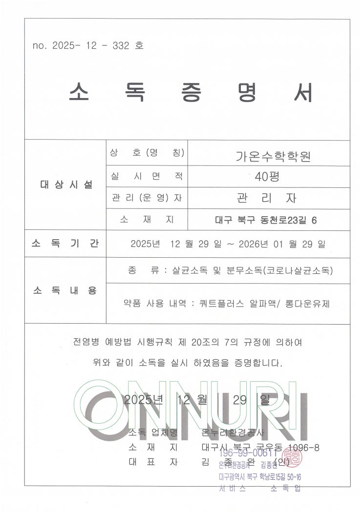 2025년 12월~2026년 1월 학원전체 정기소독 완료