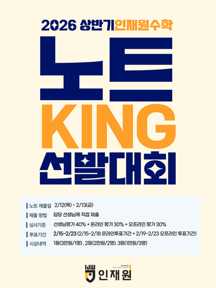 좋은 교육이 인재를 만듭니다. 안녕하세요. 침산동 수학학원 인재원입니다. 2026년 노트킹 선발대회의 온라인 평가를 인재원 공식 블로그에서 진행합니다. 아래 투표 방법을 꼭 참고해 주세요! <투표 방법 및 투표 기간> 동일한 아이디로 한 노트에 투표가 가능합니다. 번호를 확인하셔서 마음에 드는 노트를 골라 댓글로 남겨주세요. 예시: "기호 1번 투표합니다." 2월 15일 ~ 2월 18일 자정까지. 댓글 쓰기는 15일부터 열립니다. ※ 댓글을 여러 번 남기면 무효 처리됩니다. 기호 1번: 박○연 기호 2 김○영 기호 3 이○혁 기호 4 서○원 기호 5 윤○소 기호 6 장○서 기호 7 조○나 기호 8 박○율 기호 9 권○윤 기호 10 이○....... <img src="https://blogthumb.pstatic.net/MjAyNjAyMTNfNDcg/MDAxNzcwOTc2Njc3MzU0.jE7xotNBxzmRGwCNymEZJcyQkXAi_gH8f89RCEfH_WYg.cTsN3qrY77KO-NnyzXcTebGBalJPNEPoRrDWn3CEyEYg.PNG/image.png?type=s3" />