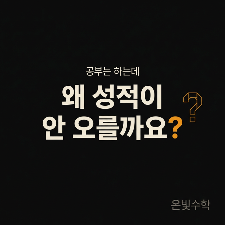 안녕하세요. 지인 소개가 많은 범어동 온빛수학학원입니다. 오늘은 상담을 오시는 학부모님들과 학생들이 가장 많이 하시는 질문에 대한 답변을 드리고자 합니다. 공부는 하는데 성적은 잘 안오르는 것 같아요. 수학 성적이 안 오르는 아이들, 대부분 이유가 같아요. 수성구에서 수학 내신을 지도하면서 성적이 안 오르는 학생들을 많이 봤습니다. 원인은 학생마다 다를 것 같지만, 실제로는 크게 세 가지 패턴으로 나뉩니다. 오늘은 그 세 가지 패턴과 각각 어떻게 해결할 수 있는지 구체적으로 설명해 드리겠습니다. 유형 1 - 개념은 아는데 자꾸 틀려요 "아는 것"과 "맞히는 것"은 달라요. 개념을 이해하는 것은 첫 번째....... <img src="https://blogthumb.pstatic.net/MjAyNjAzMTJfMTc2/MDAxNzczMzE5OTU2NTk4.K46u4d0Wk0W4CXTbZtGSFThmAtl0YO8juyPLDAMW9kAg.CrYcQHTaD9lheEGDu-5ZFYmrvL5EvqGEdEBBZC9SyiEg.PNG/%B9%FC%BE%EE%B5%BF%BC%F6%C7%D0%C7%D0%BF%F81.png?type=s3" />