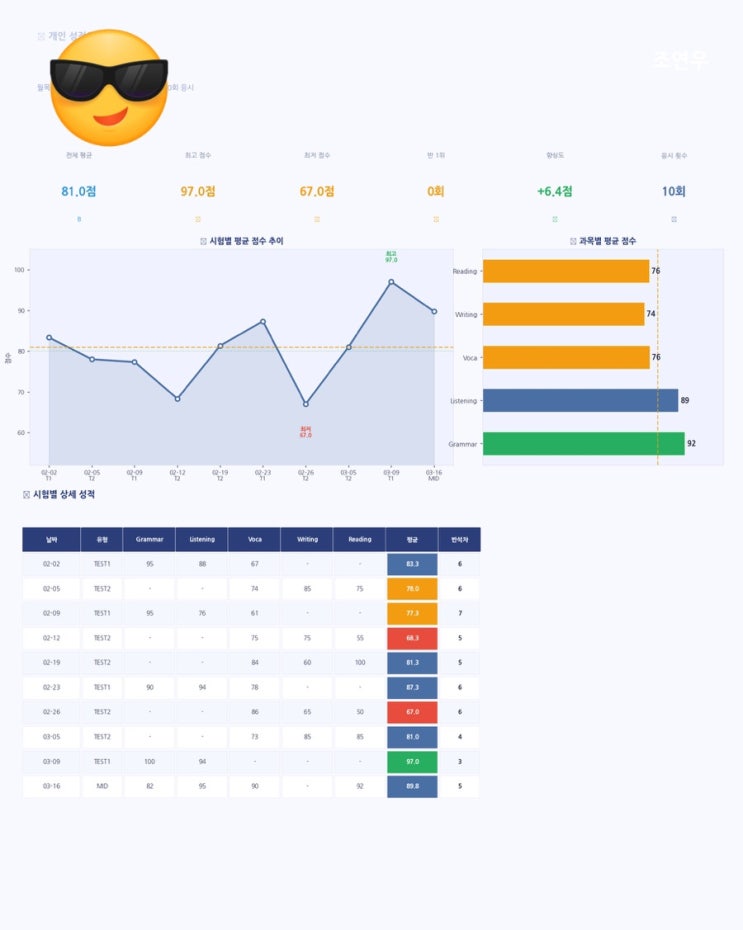 안녕하세요 셜리영어입니다. 완연한 봄!! 새학기 시작은 언제나 긴장되고 설레네요 학생들뿐 아니라 셜리의 모든 선생님들과 직원들도 마찬가지에요^_^더더 좋은 학습, 더 질적인 관리와 동기부여를 위해 무얼 더 할수 있을까를 늘 고민하고 의논하며 연구한답니다☺️ 중등부는 지난주 1session 중간평가를 실시했습니다^^ 중간평가의 결과와 더불어 1-3월까지의 영역별 취약점 및 성장 흐름을 파악할 수 있도록 성적표를 순차적 발송하게 되는데요^^ AI 시대인만큼, 셜리영어에서도 첨단의 AI기술을 도입하여 학생들의 학습성장의 흐름을 면밀히 파악하려고 합니다. 강사의 현장에서의 관찰 및 지도와 더불어, 정확한 통계로 진단....... <img src="https://blogthumb.pstatic.net/MjAyNjAzMTdfMTg0/MDAxNzczNzEwOTIwOTYy.o6FX8ld31j6NmCykxEEJi0FAFYBCkonfBxvDQwvq3bog.5zJr3u9F7TP8ezToHWzGdodhFMBPVb2qY14HI7WRMA8g.JPEG/output%A3%DF686321225.jpg?type=s3" />