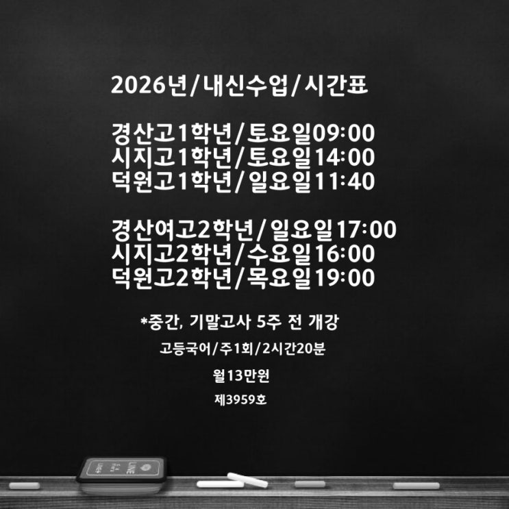 #경산고 #시지고 #덕원고 #중간고사 #기말고사 #내신수업 2026년 3월 25일부터 순차적 개강합니다. *경산여고1학년 / 수요일 19:00 개강 예정 믿고 기다려 주신 만큼 확실한 성적 향상으로 보답하는 내신수업 대형 학원과는 다른 소수의 밀착형 내신수업으로 이루어집니다. 깔끔하게 그리고 완벽하게 5주간 펼쳐지는 마법같은 내신수업 <전화 및 방문 가능 시간 안내> 월, 화 / 휴무 수, 목, 금 / 16 : 00 - 19 : 00 만 전화 및 방문 업무 가능합니다. *19 : 00 - 22 : 00 수업 하기 때문입니다. 토, 일 / 전화 및 방문 업무 불가합니다. *11 : 40 - 22 : 00 하루 종일 내신 및 정규 수업 하기 때문입니다. 김현승국어학원 (053) 795-9509 <img src="https://blogthumb.pstatic.net/MjAyNjAzMTdfMjQ0/MDAxNzczNzU5NDg5MTIy.cVqt8--5AMRShRKpNlMc-_og48fYhpCCIONVZczDWXwg.UrFG2zb-t9739SIVgkj3IjDLvj2hMHwg6Mw-WmFlaEcg.JPEG/IMG%A3%DF7613.JPG?type=s3" />