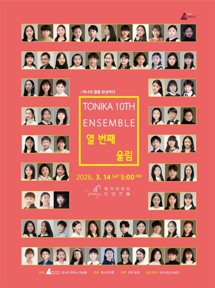 대구 수성구 피아노학원 아이들의 특별한 무대 토니카 피아노 앙상블 연주회 ‘열번째 울림’ 대구 수성구에서 피아노를 배우는 아이들에게 특별한 음악 경험이 될 **토니카 피아노 앙상블 연주회 ‘열번째 울림’**이 곧 열립니다. 피아노는 보통 혼자 연주하는 악기라고 생각하지만, 여러 명의 아이들이 함께 호흡을 맞추며 연주하는 피아노 앙상블은 또 다른 음악의 즐거움을 만들어 냅니다. 이번 연주회에서는 여러 선생님들의 제자들이 모여 두 대의 피아노에서 함께 소리를 만들어가는 뜻깊은 무대를 준비하고 있습니다. 그리고 그 무대에 꿈꾸는피아노 아이들 8명도 함께 참여합니다. 매주 토요일, 아이들의 진지한 도전 앙상블 연주는 개....... <img src="https://blogthumb.pstatic.net/MjAyNjAzMTNfMTky/MDAxNzczMzc5NTI1NzE3.61w8x91LMDScDUK6oA6ymJamY-NtOFEXhMrytB_K9qog.NLCyqocTocKqBzYzj_7mkd4posJjKKdzY3parc0aTKAg.JPEG/KakaoTalk_20260313_142503540.jpg?type=s3" />
