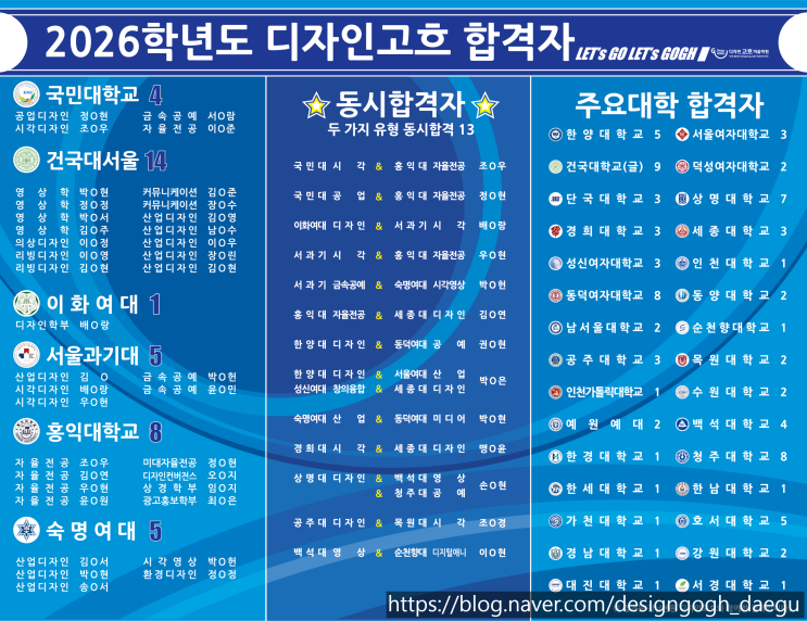 수성구 미술학원 범어동 미술학원 고흐의 봄T입니다. 타이트하게 달려왔던 겨울방학 특강이 끝나고 2026학년도 디자인고흐 합격자 명단도 함께 업로드합니다!! 최상위권과 수도권 주요 대학 합격자들이 예비반 때부터 꾸준하게 쌓아올라 온 학생들이라 더할 나위 없이 뿌듯합니다! 2026학년도 디자인고흐 미술학원 합격자 명단 겨울방학 특강이 끝나고 어제부로 입시반으로 올려보내면서 올해 더 타이트하게 진행했던 겨울방학 특강을 기록합니다. 올해 대구 디자인고흐 입시반에서는 대구 디자인고흐 입시반 메인 원장님(혁T)과 본원 소속 천안(신부)디자인고흐 원장님(손T)이 함께 입시반을 이끌어가게 되었어요. 두 원장님이 20명의 정원을 책....... <img src="https://blogthumb.pstatic.net/MjAyNjAzMDJfMTMw/MDAxNzcyNDM0MTgzMjkw.5zSYm4dQOAQlIHNEP87HMqriZQaXgk73wG4sN9DTMxEg.ndL5dpdgNvEtOHSUK2q2R3TgL8ffml82mGpal_K6dzsg.PNG/KakaoTalk_20260302_141521283.png?type=s3" />