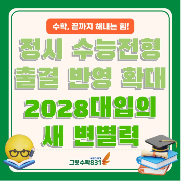 수학! 끝까지 해내는 힘! 안녕하세요~ 만촌동 수학학원 내신대비 전문 그릿수학831입니다 ^^ 그동안 정시는 오랫동안 수능이 전부인 전형으로 인식되어 왔는데요, 하지만 2028학년도 대입을 향한 새로운 변화가 있습니다! 어떤 내용인지 이번 포스팅을 통해 상세하게 확인해 봅시다! 1. 대학들, 이제 ‘출석부’를 펴 들다 2028 대입의 새로운 변별력 2028학년도 대입에서 중앙대학교는 정시 수능전형에 출결 점수 11%를 반영하겠다고 밝혔습니다. 정시는 수능 한 문제, 한 점수 차이로 합격과 불합격이 갈리는 전형입니다. 이런 구조에서 11%는 결코 상징적인 숫자가 아닙니다. 합격선 근처에 몰린 수험생들에게는 당락을 가르는 실질적인 변수....... <img src="https://blogthumb.pstatic.net/MjAyNjA0MjVfMjQ3/MDAxNzc3MDg2MTMzNDMy.S-oU_n5MKVL7LLyv3kfIw7DC8AfDYxXMWsVBq3X2JTUg.PXAchmOjw7uPu291PxbQ47hhhGSLc9ZNWHfeUdLXhHEg.JPEG/%BA%ED%B7%CE%B1%D7-%BD%E6%B3%D7%C0%CF-001_%289%29.jpg?type=s3" />