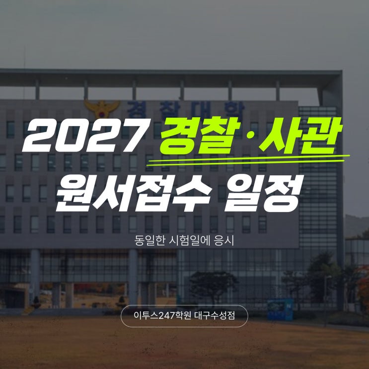 사관학교, 경찰대 모집 일정과 시험일시가 발표되었습니다. 수능과 비슷해보이지만 또 다른, 그래서 고유한 전략으로 대비해야하는 시험인데요. 그럼에도 불구하고 '현장감'이라는 포인트에서 수능을 대비하는 수험생에게도 유의미한 시험이 될 수 있습니다. 주의사항 사관학교와 경찰대는 26년 8월 1일 같은 날 시험을 실시하므로 동시 지원이 불가능합니다. 2027학년도 경찰대, 사관학교 원서접수 안내 1. 전형 일정 2. 경찰대 vs 사관학교 시험 구성 비교 3. 출제범위 수능과 유사, 단 문제 형태와 객관식 주관식 배치 등은 수능과 다른 점 있음 국어 - 공통 : 독서 + 문항 영어 - 영어Ⅰ, 영어Ⅱ (듣기 평가 없음) 수학....... <img src="https://blogthumb.pstatic.net/MjAyNjA0MjhfMTQy/MDAxNzc3MzYwODExNTg4.te1ScOnkP2foVsvzcEBuOZmc7V1DkN69R5q19humFIIg.0l_VaNrvxQcDFuZw6GfQnbXf5zNwxxdoYFuVVuX8NXMg.JPEG/police.jpg?type=s3" />