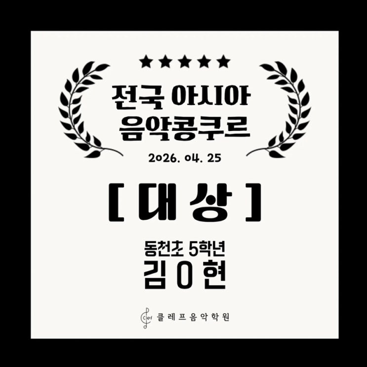 [ 전국 아시아 음악 콩쿠르 ] 초등부 5학년 대 상 고득점 수상을 축하합니다! 3월이후 새학기 클레프 첫 콩쿨에서 우수한 성적을 받아왔어요 실수없이 준비한대로 무대를 완성하고 내려오더니 좋은 결과 받은 것 같아요! 고 학년 올라가면 사실 긴장감이 커져서 마인드컨트롤 하기가 더 힘들어서 오히려 연습때보다 무대에서 실수가 잦아지는데 실수없이 준비한 대로 연주를 해주어서 더 기특했답니다! 클레프 새학기 콩쿨부터 좋은 결과를 가져와줘서 너무 고마워✨ 클레프 음악학원 범어래미안 정문 옆 상가 2층 [ 동천초 도보2분 ] 문의. 010-7711-2092 <img src="https://blogthumb.pstatic.net/MjAyNjA0MjhfMTg4/MDAxNzc3MzgyMDYzNzAw.ZHlbLYhz70vT7cPdGkUx16-PEjWkI_C__-wl_HSBKFog.FR0x-AqlulGq9oJsTh-Y-shRfj8JTDKO-32Sx2HTVMQg.JPEG/output%A3%DF353418565.jpg?type=s3" />