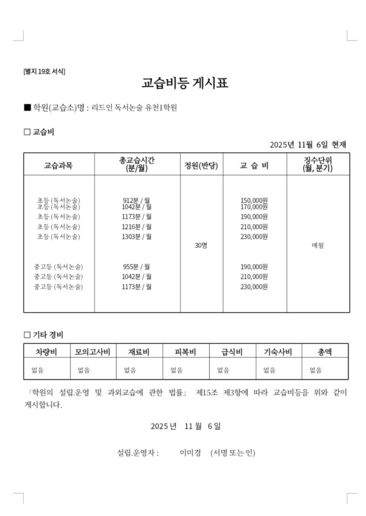 교습비 게시표