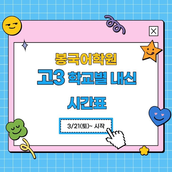 고3 내신 대비반이 3월 21일(토)부터 시작됩니다! 안녕하세요, 봉국어학원입니다 고3을 준비하는 중요한 시기, 본격적인 내신 대비가 곧 시작됩니다. 이에 맞춰 고3 내신 시간표가 준비되어 안내드립니다. 고3 내신대비 시간표 이번 고3 내신반은 ✔️정시반 ✔️화작반(효성여고) ✔️언매반(효성여고/대건고) ✔️원화여고 ✔️송현여고 이렇게 세분화되어 운영됩니다. 학생들의 선택 과목과 목표에 맞춰 맞춤형 수업이 가능하다는 점이 가장 큰 장점입니다. 현재 재원 중인 고3 학생들은 수능특강 과정을 꾸준히 진행하며 기본기를 다지고 있고, 실전 모의고사도 병행하면서 실전 감각까지 함께 끌어올리고 있습니다. 자세한 시간....... <img src="https://blogthumb.pstatic.net/MjAyNjAyMjZfMzEg/MDAxNzcyMTA3NTEwODU4.KWb4jFWi5o5ifcIzfO3nw-U2R2ZedsO7trFe9R46SFcg.G4pIMsFQ_AEU-mnbCIZdVV18ZGmX_AaJyIrviUaiaR8g.JPEG/%C1%A6%B8%F1%C0%BB_%C0%D4%B7%C2%C7%D8%C1%D6%BC%BC%BF%E4._%288%29.jpg?type=s3" />