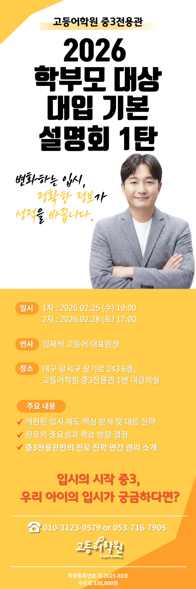 안녕하세요;) 고등어학원 중3전용관입니다. 지난주, 중3 학부모님들을 모시고 진행한 대학 입시 설명회를 마쳤습니다. 설명회를 준비하면서 가장 많이 고민한 부분은 단 하나였습니다. 정보를 많이 드리는 자리가 아니라, 방향을 분명하게 잡아드리는 자리가 되자. 실제로 현장에서 뵌 학부모님들의 표정에는 공통된 감정이 담겨 있었습니다. 기대와 동시에, 막연한 불안이었습니다. 설명회는 화려한 자료나 자극적인 문구로 시작하지 않았습니다. 대신 현실적인 정보와 구조부터 차분히 짚어드렸습니다. 고1 1학기 중간고사부터 내신이 누적된다는 점, 상대평가 체제에서 1~2문항이 등급을 가른다는 사실, 그리고 학생부가 단순 기록이 아니라 입....... <img src="https://blogthumb.pstatic.net/MjAyNjAyMjhfMjY0/MDAxNzcyMjY4MTk0MDAw.MoQeHWNZcUER41kS4Bhn8mjHaLzqjmrAHsOc0czaEUMg.COR-VmN0x0yWtngIKAiLoV1EZ7aacXRMPdu5MHQ5fH8g.PNG/image.png?type=s3" />