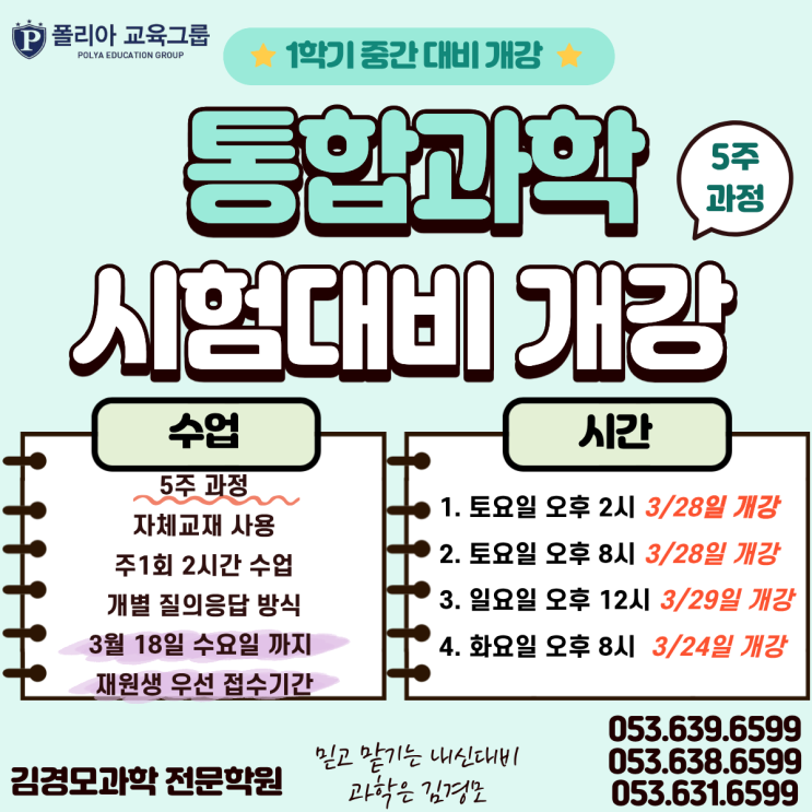 안녕하세요 김경모 과학학원입니다. 1학기 중간고사 통합과학 시험 대비 시간표 안내드립니다. 주 1회 2시간 수업입니다. 5주 과정이며, 자체교재로 진행 될 예정입니다. :) 1. 토요일 오후 2시 3월 28일 개강 2. 토요일 오후 8시 3월 28일 개강 3. 일요일 오후 12시 3월 29일 개강 4. 화요일 오후 8시 3월 24일 개강 화요일 오후 8시 개강반은 기존 31일에서 24일로 개강일이 변경되었으니, 확인 하신 후 수강예약 부탁드립니다 :) ※ 3월 18일 수요일까지 재원생 우선 접수 기간이며, 정원 선착순 마감됩니다※ 수강 희망 하시는 학부모님께는 시간, 요일, 날짜 꼼꼼하게 확인 후 아래 번호로 문자로 수강예약 부탁드립니다:) ☎....... <img src="https://blogthumb.pstatic.net/MjAyNjAzMTZfMjIx/MDAxNzczNjQ2Nzc2MjU2.lIbiDG4C4RHafinmJQgTGOlkq2Ub83fdxvNylNQHor4g.AedO4Kw7RtB-3CjYpbQjW_69Uviahoyfp67voRIgizIg.PNG/%C5%EB%B0%FA_%BA%AF%B0%E6.png?type=s3" />