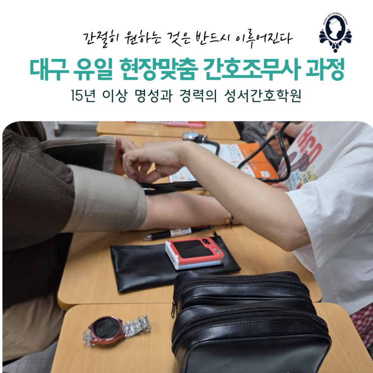 안녕하세요. 성서간호학원 원장 김정애입니다. 성서간호학원에서 진행한 현장맞춤 간호조무사 양성과정은 생각보다 많은 분들의 관심 속에 이번 모집이 조기 마감되었습니다. 문의 상담을 진행하다 보면 이 과정에 대해 특히 많이 하셨던 질문이 있습니다. “이런 실무 교육은 어디에서 받을 수 있나요?” “자격증은 있는데 실무를 좀 더 배워야할 것 같아요..” “병원에서 실제로 사용하는 기술을 배우고 싶습니다..” 그만큼 많은 분들이 단순히 자격증 취득 이후가 아니라 현장에서 바로 활용할 수 있는 실무 교육에 대한 필요성을 느끼고 있다는 것을 알 수 있었습니다. 이번 교육 과정은 여성가족부 지원 경력단절여성 직업교육훈련 프로....... <img src="https://blogthumb.pstatic.net/MjAyNjAzMTZfMjUw/MDAxNzczNjI4OTYzODQx.bp8iCWYV5hr4HEdKGBtiffpjNJbobg2brQMBpacIR-8g.pDZOzpdJwd47KqbPNl3mLxjsKNqT7FLPmEoXVX55FZgg.PNG/%C1%A6%B8%F1%C0%BB-%C0%D4%B7%C2%C7%D8%C1%D6%BC%BC%BF%E4_-001_%2876%29.png?type=s3" />