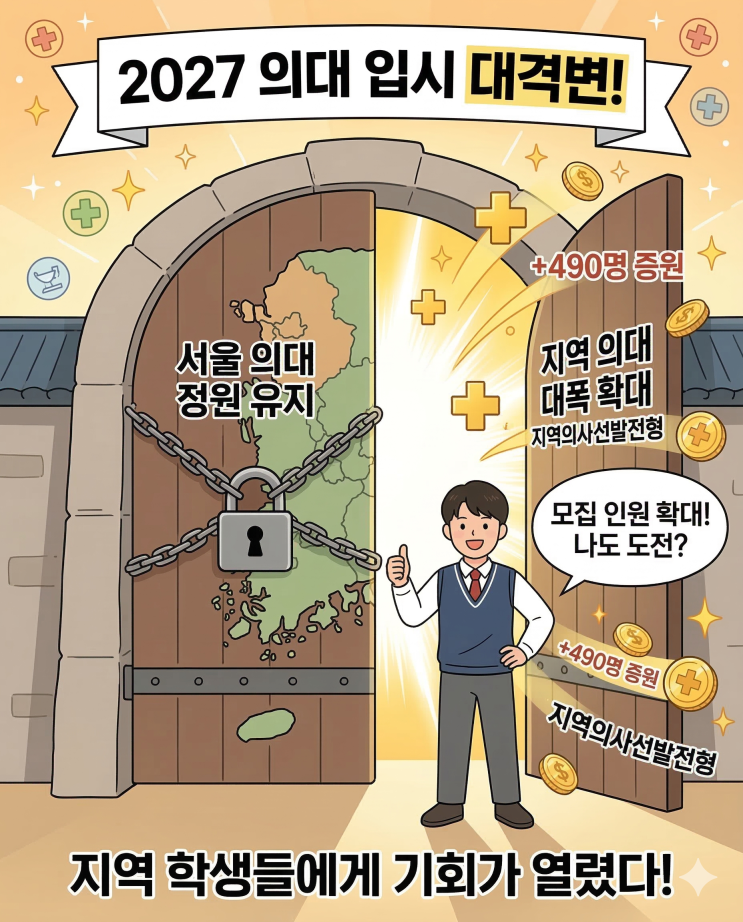 2027학년도 의대 정원이 490명 증원 확정되었습니다! 늘어난 정원은 전원 비수도권 의대에 배정되었는데요. 특히 '지역의사선발전형' 의무화로 인해 강원, 제주, 충북 등 일부 지역 학생들에게 엄청난 기회가 찾아왔습니다. 어디가 유리하고 어디가 치열한지, 한 장의 인스타툰으로 싹- 정리했으니 우리 아이 입시 전략 수립에 꼭 활용해 보세요! 지난 10일, 정부가 2027학년도 의대 입시부터 서울을 제외한 32개 의대 정원의 최소 10% 이상을 '지역의사선발전형'으로 선발하도록 하는 시행령을 확정함 당장 2027학년도부터 해당 지역에서 중·고교를 나오고 거주 요건을 충족한 학생들은 지역의사선발전형으로 지원하기....... <img src="https://blogthumb.pstatic.net/MjAyNjAzMTVfMTA1/MDAxNzczNTYyNjc5MDY5.lyQe3hBbzd0aeU9pnBK23UAb8G-g5wlkpvoJCuYMzjgg.EzVDwhoijMBU_3Iwlwx3VnKx32BzScHVLt00_RC90iMg.PNG/Gemini_Generated_Image_rrh8iorrh8iorrh8.png?type=s3" />