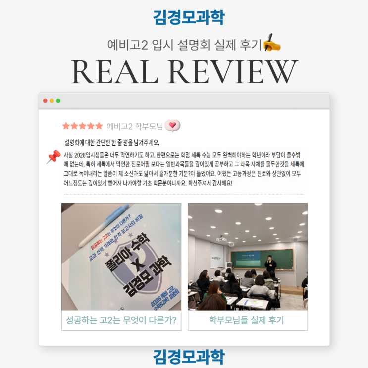 안녕하세요, 김경모과학입니다 최근 진행된 설명회에 많은 학부모님들께서 참석해 주셨고, 이후 구글폼을 통해 소중한 후기를 남겨주셨습니다. 진심 어린 의견 하나하나에 깊이 감사드립니다 :) ✔ 생기부와 탐구 방향까지 제시한 설명회 단순히 활동을 나열하는 생기부가 아니라 “어떤 방향으로 준비해야 하는지 알 수 있었다”는 의견이 많았습니다. 특히 탐구 주제를 어떻게 정해야 하는지, 아이의 진로와 어떻게 연결해야 하는지를 구체적으로 설명해 드리면서 막막했던 부분이 정리되었다는 후기가 인상적이었습니다. 생기부는 결과가 아니라 과정이라는 점, 그리고 작은 활동 하나도 방향성이 중요하다는 점을 다시 한번 생각해 보는....... <img src="https://blogthumb.pstatic.net/MjAyNjAyMjhfMTIg/MDAxNzcyMjU2NDg4NDE3.aujTqRzSO8W_Sp8eTKGr9EFewwaAzOyKfHUBw8rVUgMg.RFGv_2EGiFMQmv50gHyEAllYqqjTa55zjh6rF6g6DY0g.PNG/1.png?type=s3" />